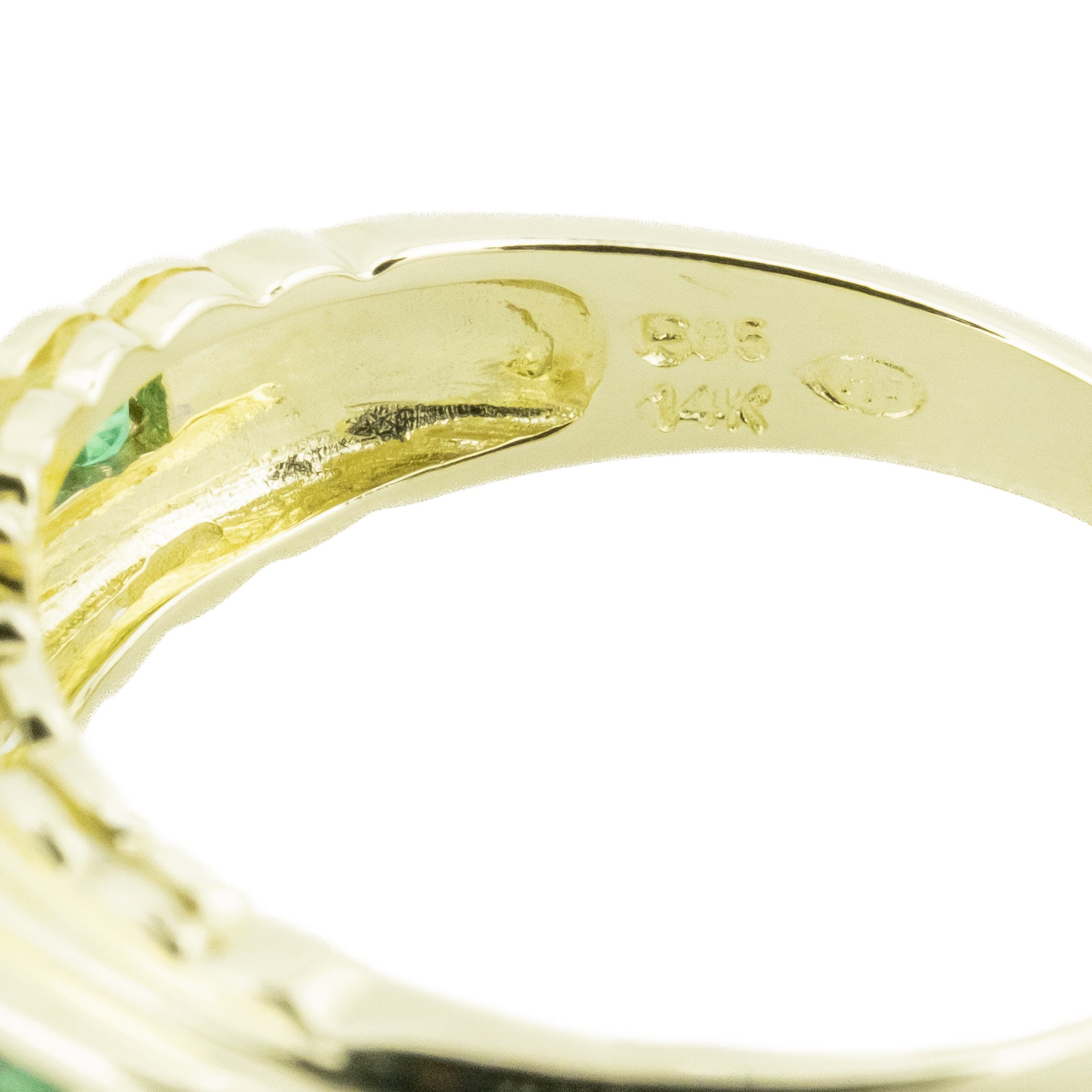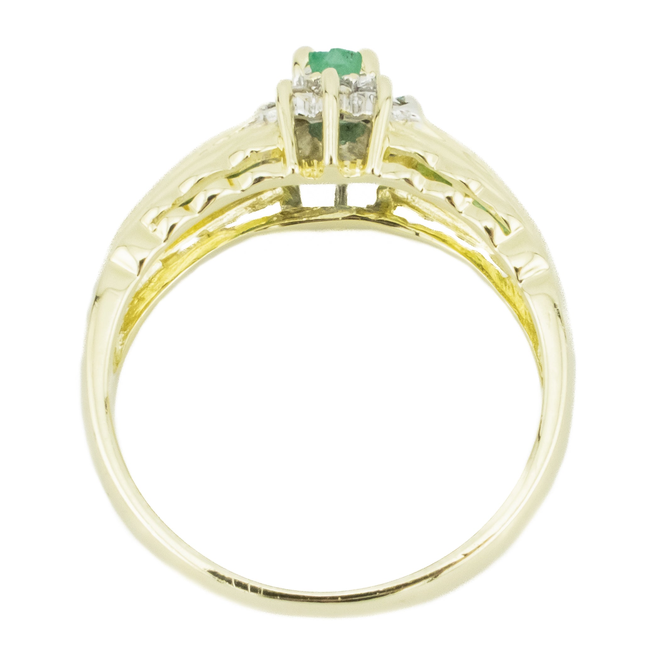 This Emerald with diamond accents gemstone ring is an estate item. It is in good condition. The gemstone ring has been cleaned and inspected by a professional jeweler. All diamonds have been graded by our GIA trained Accredited Jewelry Professional. All diamond and gemstone weights are approximate. See photos for reference.