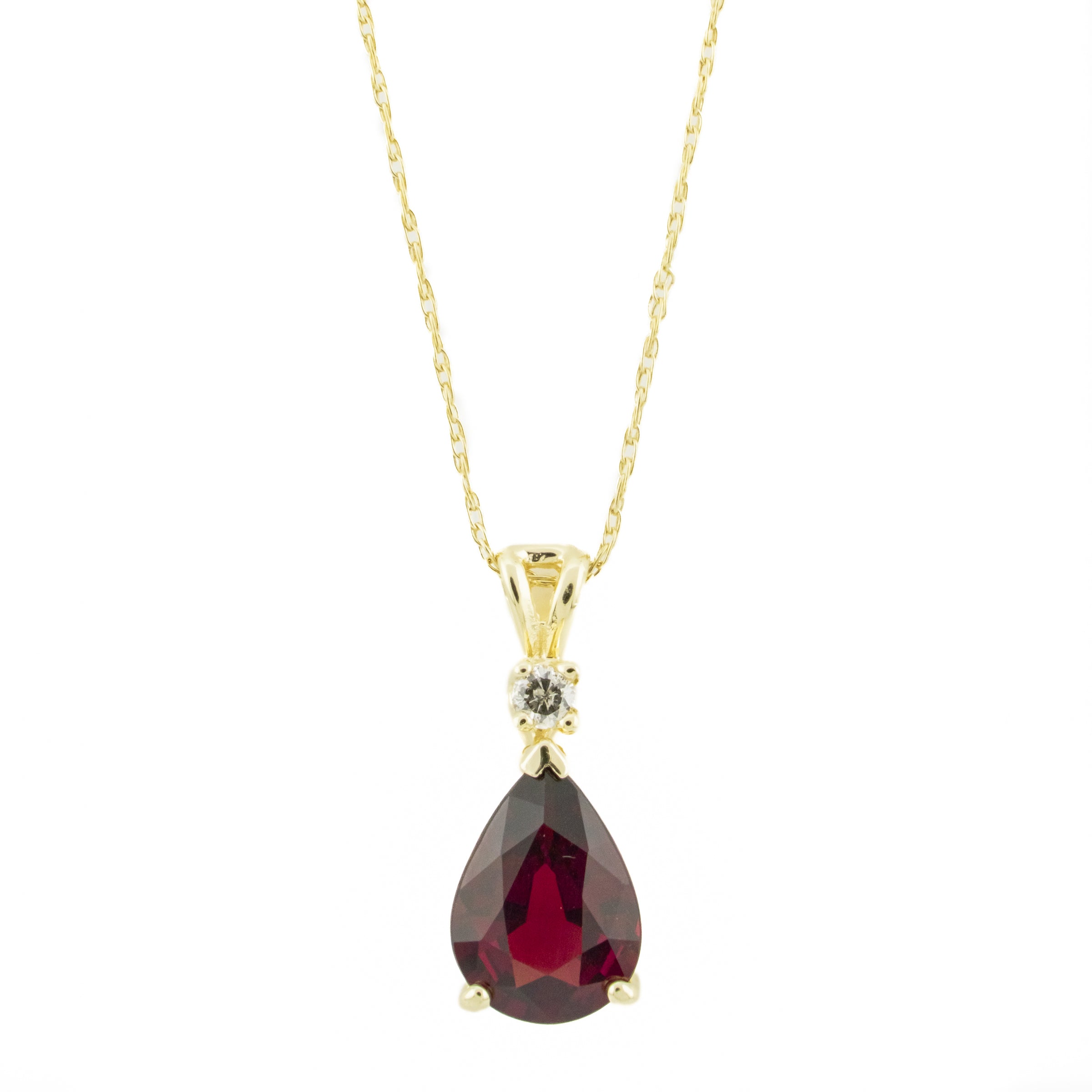 This garnet and diamond pendant with a gold chain is an estate item. It is in good condition. The necklace has been cleaned and inspected by a professional jeweler. All diamonds have been graded by our GIA trained Accredited Jewelry Professional. All diamond and gemstone weights are approximate. See photos for reference.