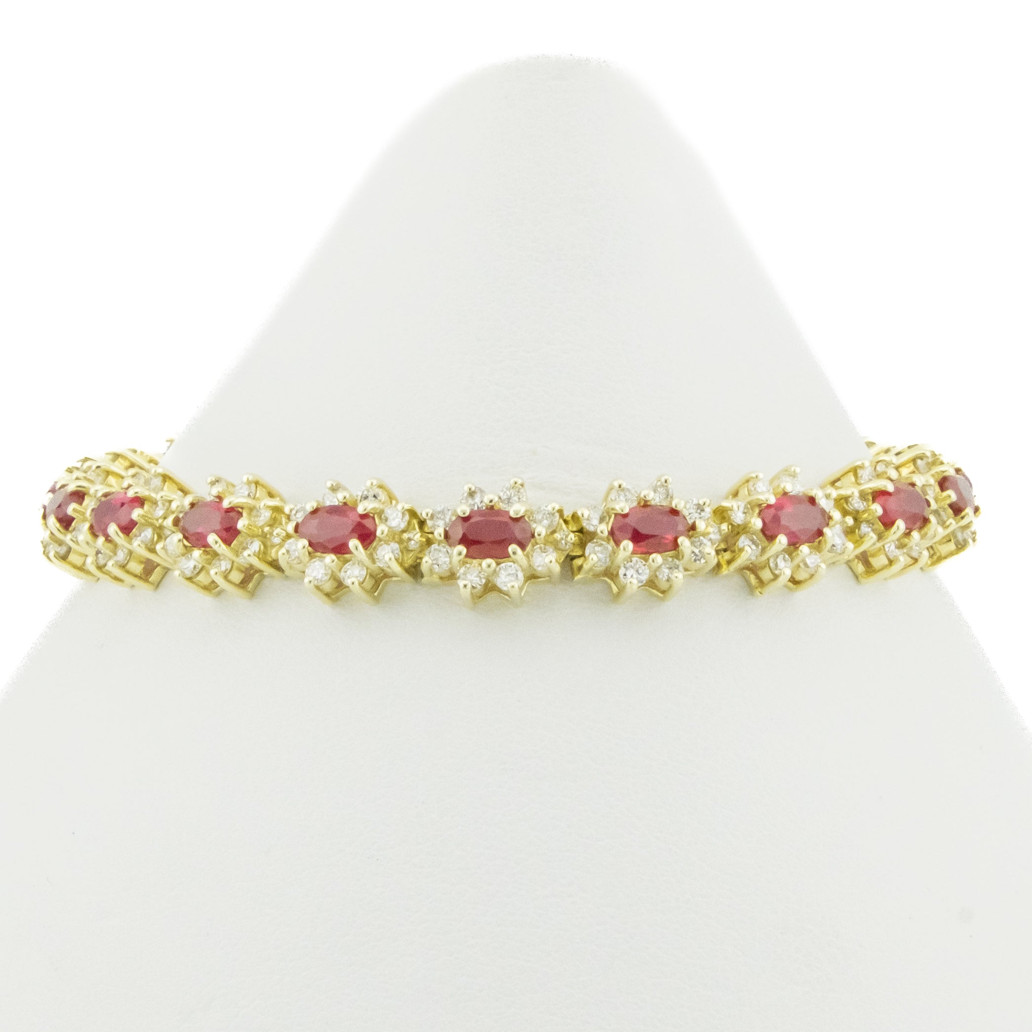 This ruby and diamond bracelet is an estate item. It is in good condition. The gemstone bracelet has been cleaned and inspected by a professional jeweler. All diamonds have been graded by our GIA-trained Accredited Jewelry Professional. All diamond and gemstone weights are approximate. See photos for reference.