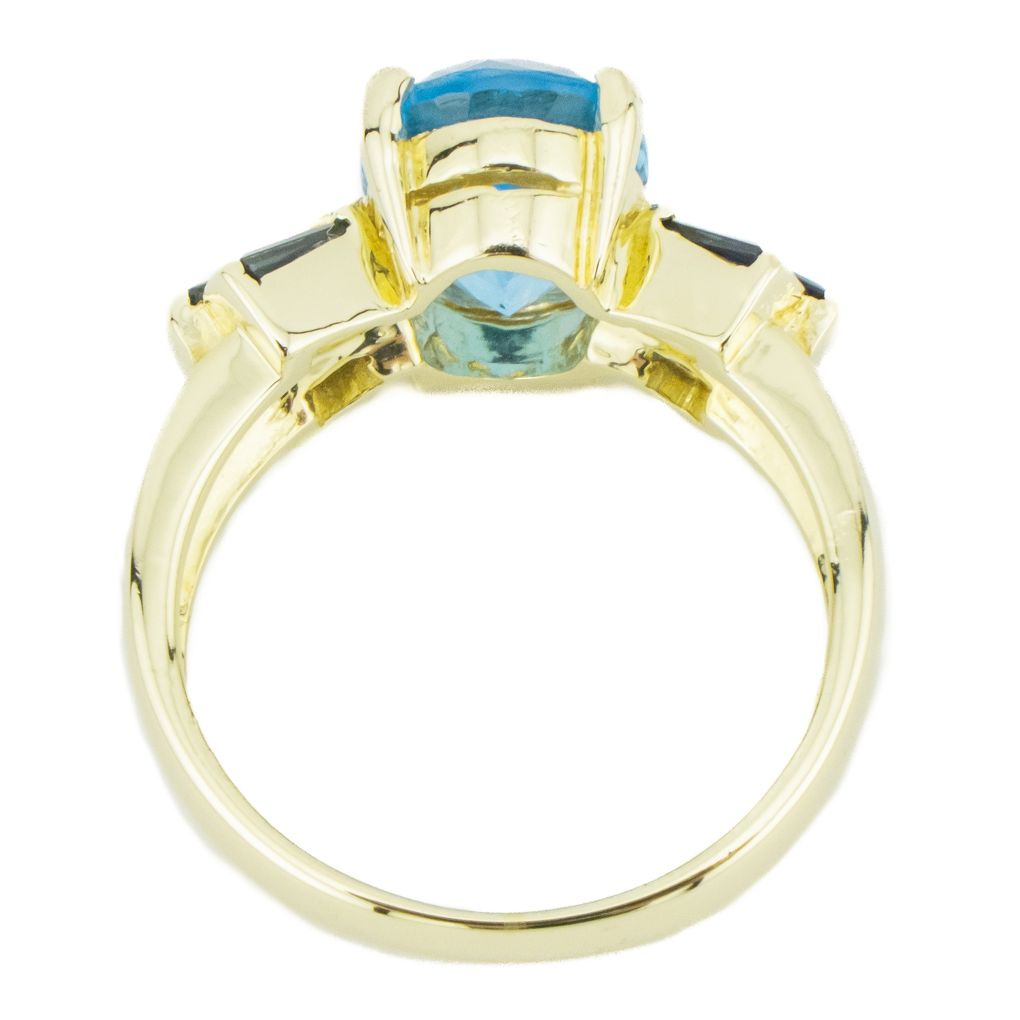 This blue topaz ring is an estate item. It is in good condition. The ring has been cleaned and inspected by a professional jeweler. All diamonds have been graded by our GIA trained Accredited Jewelry Professional. All diamond and gemstone weights are approximate. See photos for reference.