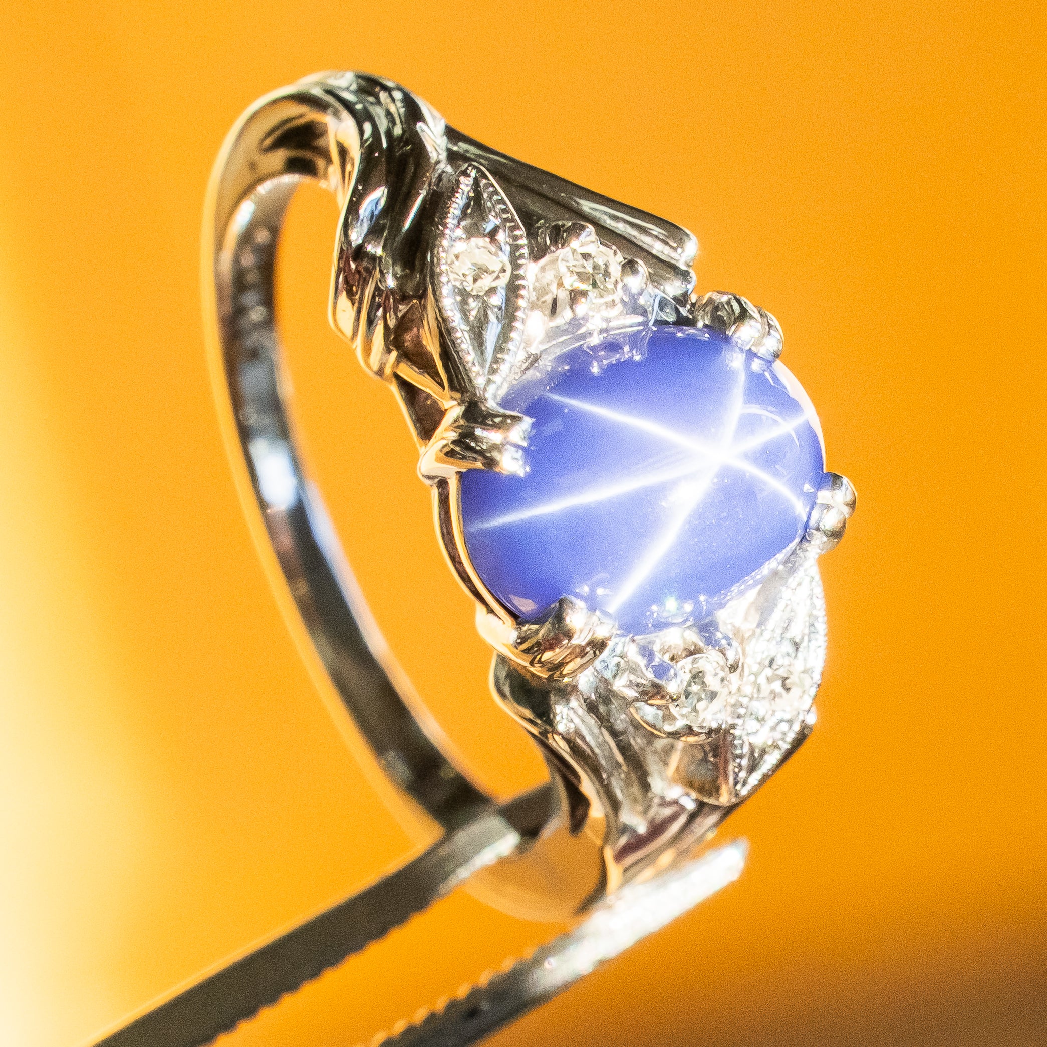 This Lindy star sapphire and diamond accented ring is an estate item. It is in good condition. The ring has been cleaned and inspected by a professional jeweler. All diamonds have been graded by our GIA trained Accredited Jewelry Professional. All diamond and gemstone weights are approximate. See photos for reference.