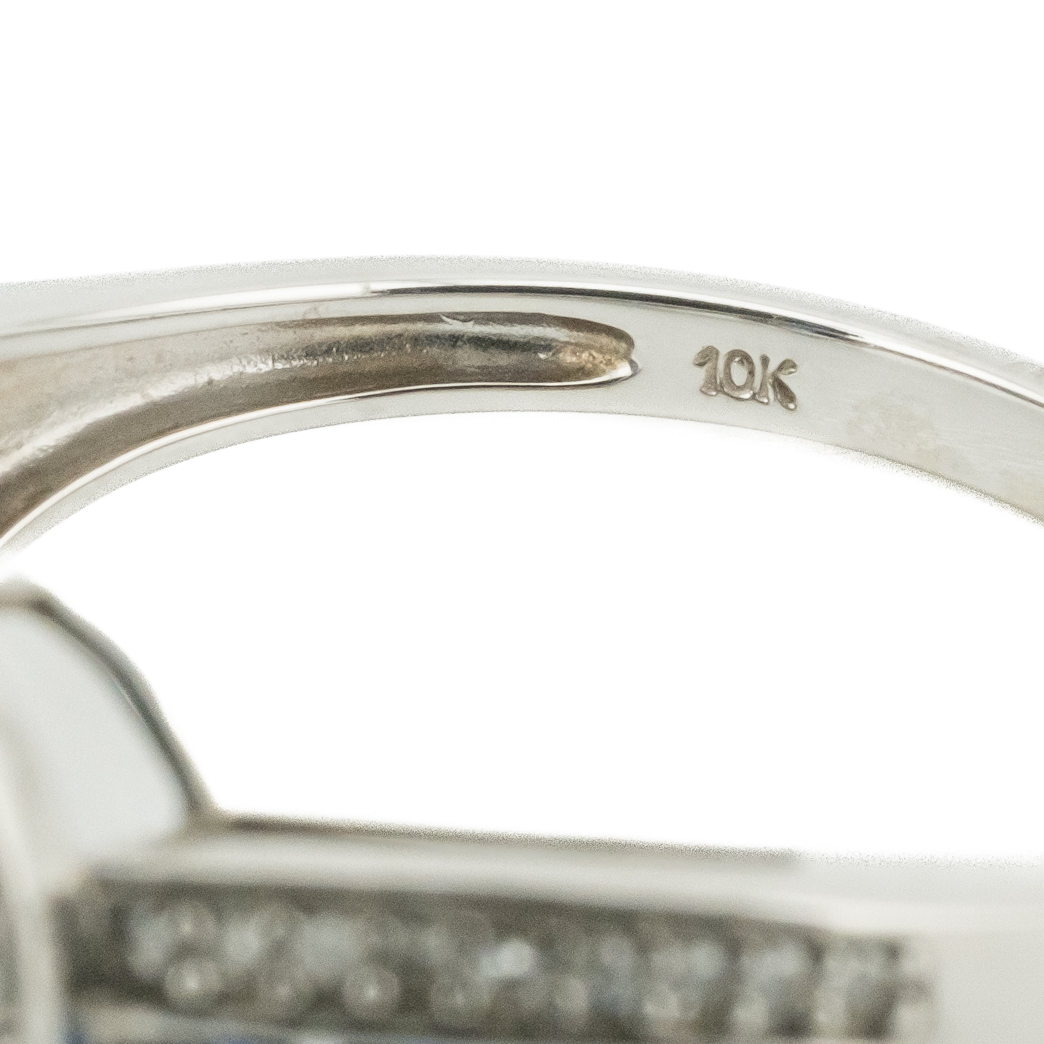 This sapphire and diamond accented ring is an estate item. It is in good condition. The gemstone and diamond ring has been cleaned and inspected by a professional jeweler. All diamonds have been graded by our GIA trained Accredited Jewelry Professional. All diamond and gemstone weights are approximate. See photos for reference.