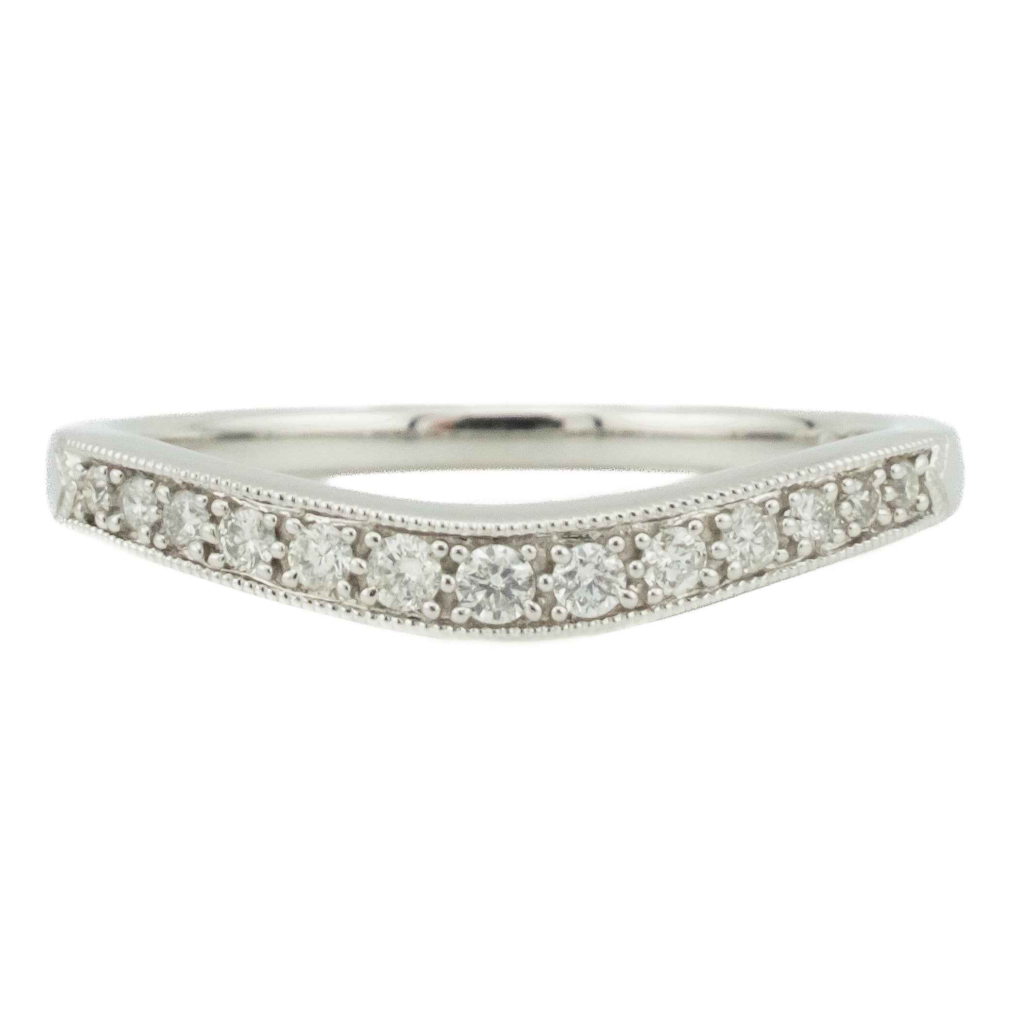 This diamond accented wedding band is a state item. The wedding band has been inspected by a professional jeweler. All diamonds have been graded by our GIA trained Accredited Jewelry Professional. All diamond and gemstone weights are approximate. Please see the photos for reference.